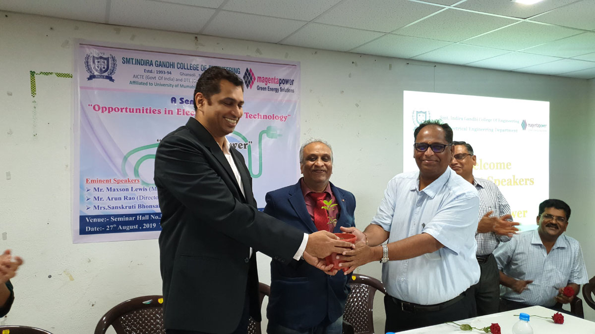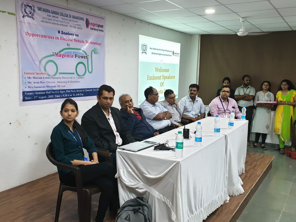 Electric Vehicle club of Electrical Department in Smt Indira Gandhi College of Engineering organized Seminar on Opportunities in Electric Vehicle Technology in association with Megenta Power on 26 August 2019 at 10.30 AM in Seminar Hall.
