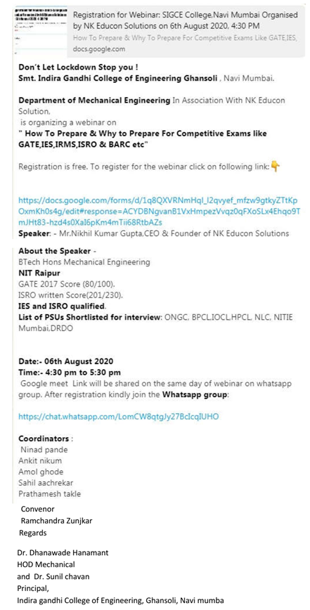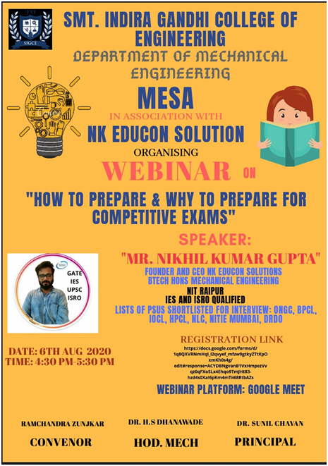 A webinar was held on ‘How to prepare and Why to prepare for competitive exams’ which was leaded by the speaker Mr. Nikhil kumar gupta founder and CEO of NK educon solutions organized by the T&P club of SIGCE for the students of Mechanical engineering branch of SIGCE on 6th of August 2020 from 4.30 pm to 5.30 pm and the platform for webinar was GOOGLE MEET.