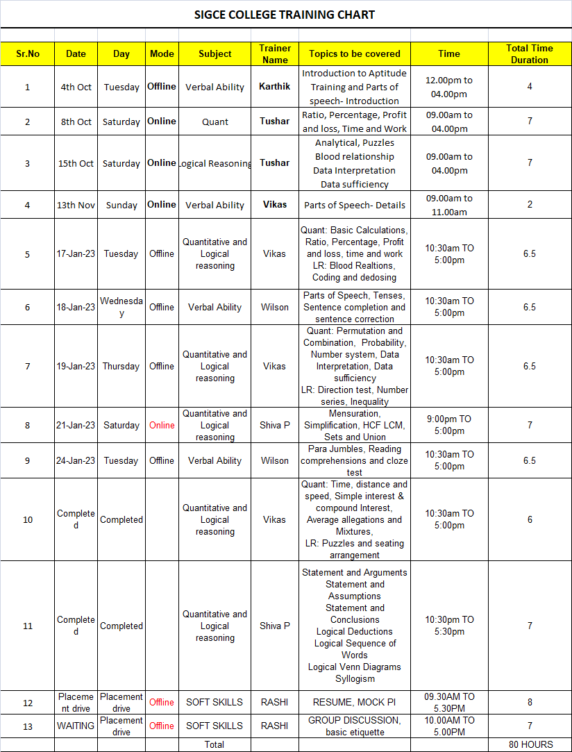 80 Hours aptitude training program for TE and BE students successfully completed on given below dates which is required to crack top MNC company’s aptitude tests