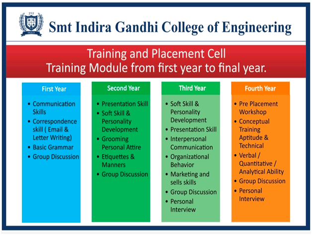The Training and Placement Cell is one of the integral parts of our college. Training & Placement activities are organized throughout the year with a view to prepare the students to appear in the campus recruitment process with confidence. The first year engineering students are encouraged to participate in various competitions such as debate, group discussion, PowerPoint presentation, essay writing etc. in order to enhance their confidence, reading, writing and communication skills. Students of second year engineering are trained on basic language skills in the well-developed Language laboratories of the institute. To prepare and train aspiring learners to face campus recruitment, the third-year engineering students are provided with exhaustive training with relevance to communication skills, aptitude test and overall development for personal & professional grooming. These training programs give the students tips on how to crack aptitude, group discussion, interview skills and resume preparation.